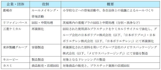 本取り組みでは、生活に身近なドレッシングのキャップや中栓を対象にケミカルリサイクルの循環プロセスを構築します。鹿嶋市の公立小学校を対象にドレッシングのキャップや中栓の回収実験を行い、回収されたキャップや中栓をリファインバースで一次処理し、三菱ケミカルにて油化、日本ポリプロ・日本ポリエチレンにて樹脂化、メビウスパッケージングにて再度ドレッシングのキャップや中栓に成型、キユーピーにて製品を製造後、カスミ鹿嶋スタジアム店にて販売し、また鹿嶋市民の皆様の手元に戻ってくるという一連の循環サイクルを実現します。対象商品の販売※4は2025年夏ごろを予定しております。