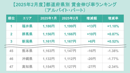 アルバイト・パートの都道府県別賃金伸び率ランキング(前月比)トップ3は、1位が福井県(増加額+13円、増加率+1.10%)、2位が群馬県(増加額+10円、増加率+0.87%)、3位が新潟県(増加額+6円、増加率+0.52%)でした。