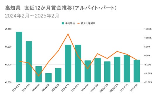 1位の福井県と47位の高知県における直近12か月の賃金推移を比較すると、福井県は2024年4月から同年7月にかけて賃金が緩やかに上昇し、その後は横ばいで推移。高知県では2024年3月から4月にかけて大幅に減少、同年6月から7月にかけて大幅な上昇が見られました。特定企業が複数出稿している高時給求人の増減が影響しています。