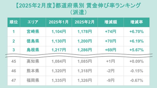 派遣の都道府県別賃金伸び率ランキング(前月比)トップ3は、1位が宮崎県(増加額+74円、増加率+6.70%)、2位が徳島県(増加額+70円、増加率+6.19%)、3位が島根県(増加額+69円、増加率+5.67%)でした。