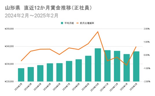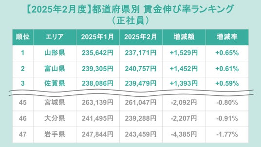 正社員の都道府県別賃金伸び率ランキング(前月比)トップ3は、1位が山形県(増加額+1,529円、増加率+0.65%)、2位が富山県(増加額+1,452円、増加率+0.61%)、3位が佐賀県(増加額+1,393円、増加率+0.59%)でした。