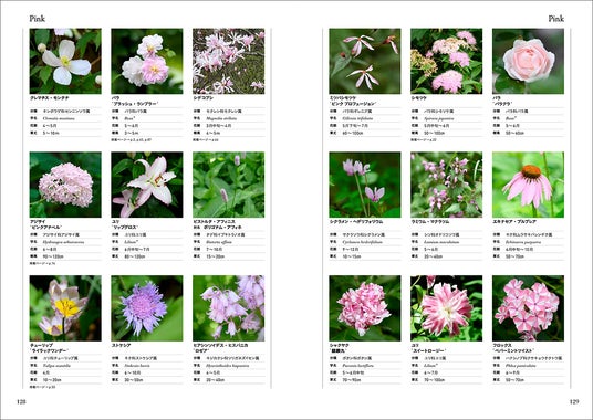 「蓼科高原 バラクラ イングリッシュガーデン」で育つ126の植物を色別に並べて図鑑として紹介しています。