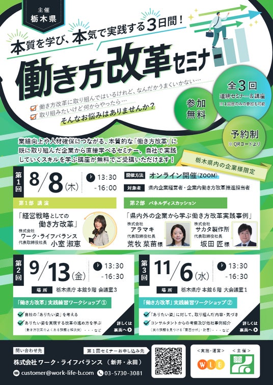 2006年の創業以来3,000社の働き方改革を支援する株式会社ワーク・ライフバランス(所在地:東京都港区、代表取締役社長:小室淑恵、以下「当社」)は、このたび、栃木県「令和6年度働き方改革推進サポート講座事業」(以下「本事業」)を受託したことをご報告いたします。