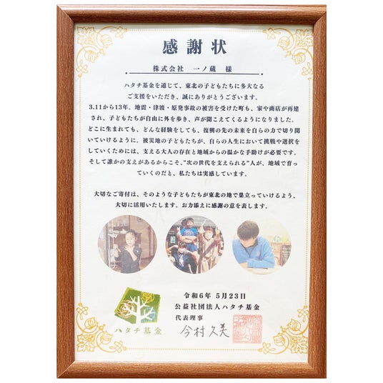 一ノ蔵 特別純米原酒 3.11未来へつなぐバトンは今年で14回目の発売。本品の弊社売上金全額を被災した子どもたちの支援を行っている公益社団法人ハタチ基金へ寄付します。