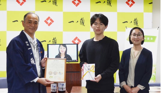 ↑【2024年寄付金贈呈の様子】 <写真左から> 弊社代表取締役社長 鈴木整、 (中央モニター)公益社団法人ハタチ基金代表理事 今村久美さん、コラボスクール卒業生 古川真愛さん、 公益社団法人ハタチ基金事務局 芳岡千裕さん。