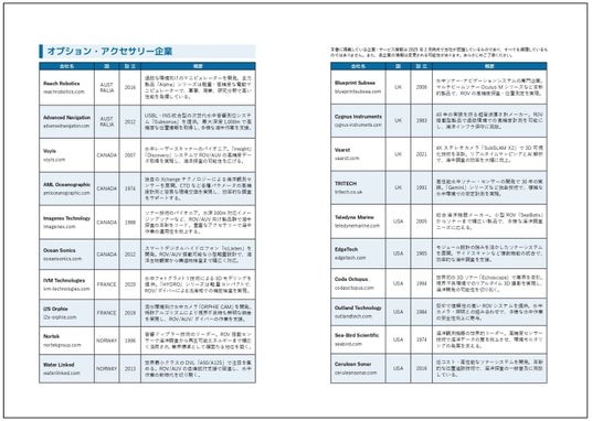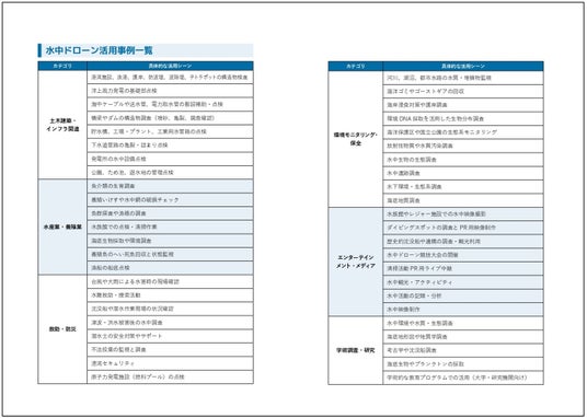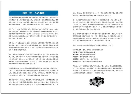 序章、水中ドローン活用事例一覧、水中ドローン主要メーカーリスト、オプション・アクセサリー企業、国内外展示会一覧ほか