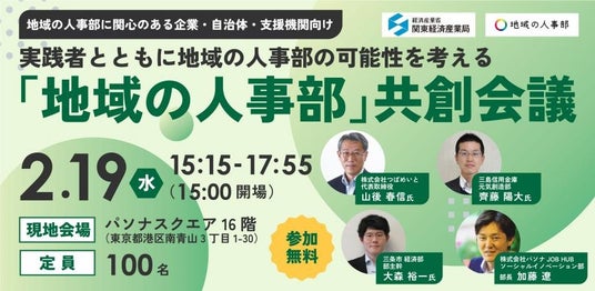 株式会社パソナJOB HUB(本社:東京都港区、代表取締役社長:高木 元義)は、関東経済産業局から受託・運営する「令和6年度 関東経済産業局における地域中小企業・小規模事業者の人材確保支援等事業」の一環で、主に地域中小企業や自治体、個人の方等を対象にしたイベント「『地域の人事部』共創会議 ~実践者とともに地域の人事部の可能性を考える~」を2月19日(水)にPASONA SQUARE(東京・南青山)にて開催いたします。