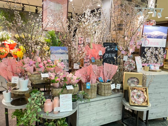 約1万8千本の西川町産の啓翁桜が入荷。その他、桜に関するフラワーアイテムを販売します。