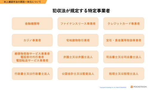 これにより、犯収法上の特定事業者(下図)はオンラインでの本人確認において公的個人認証への対応を迫られます。