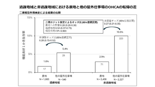 社会復帰率を過疎地域と非過疎地域で農地と他の屋外仕事場をそれぞれ比較したところ、農地における院外心停止の社会復帰率は、過疎地域では1.6%、非過疎地域では2.9%と低く、他の屋外仕事場(過疎地域では5.4%、非過疎地域では10.0%)よりもはるかに低かった。屋外仕事場でのOHCAの転帰に関連する主な要因を多変量解析したところ、年齢が75歳以上の割合が高いこと、救急隊反応時間の遅延、目撃の可能性やバイスタンダーによるAED使用・心肺蘇生の実施率が低いことが、農地の低い生存率と関連することが分かった。