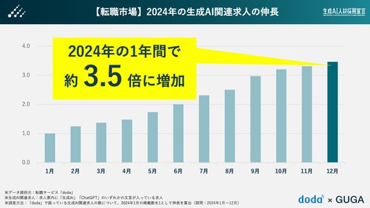 転職サービス「doda」提供のデータによると、転職市場における生成AI関連求人(※)の数は、2024年1月から2024年12月の1年間で約3.5倍に増加しています。