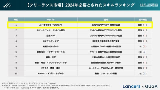 また、フリーランスマッチングプラットフォーム「Lancers」が発表した「2024年必要とされたスキルランキング」では、「AI・機械学習・ChatGPT」が第1位にランクインし、生成AIのシステム開発や活用コンサルティングといった新たなスキルの需要が急増したといいます。