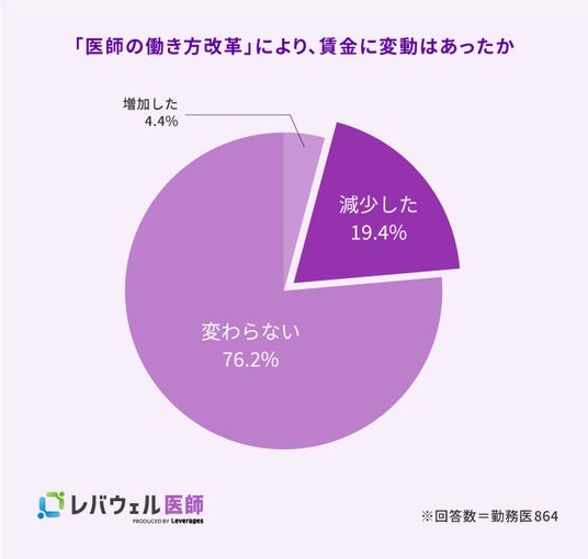 「医師の働き方改革」による賃金の変動状況を聞いたところ、医師の76.2%が改革後も「変わらない」と回答し、ほとんどの人が影響を受けていないことがわかりました。
