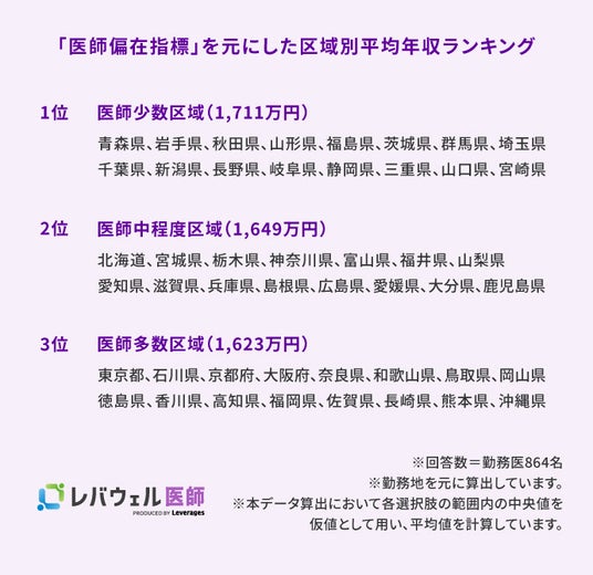 また、厚生労働省の「医師偏在指標」*6に基づき、医師多数区域、医師少数区域、医師中程度区域の3区分に仮定した上で医師の平均年収を調査した結果、1位は医師少数区域「平均年収1,711万円」、2位は医師中程度区域「平均年収1,649万円」、3位は医師多数区域「平均年収1,623万円」となりました。医師数が少ないとされる医師少数区域で勤務する医師は、医師が多いとされる医師多数区域で勤務する医師に比べて、年収が高い傾向が明らかになりました。この結果から、医師不足が深刻な地域では、年収の引き上げが医師の確保策として機能している可能性が示唆されます。