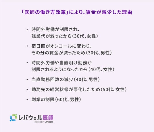 - 医師の約20%が働き方改革により賃金が「減少した」と回答、理由は「時間外手当の減少」