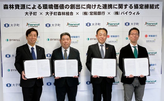日本全国47都道府県のカーボンニュートラル実現を目指す株式会社バイウィル(本社:東京都中央区、代表取締役社長:下村 雄一郎、以下「バイウィル」)は、茨城県大子町(*1)、大子町森林組合(*2)、株式会社常陽銀行(*3)と、森林資源による環境価値の創出に向けた連携に関する協定を締結しました。