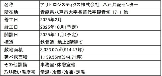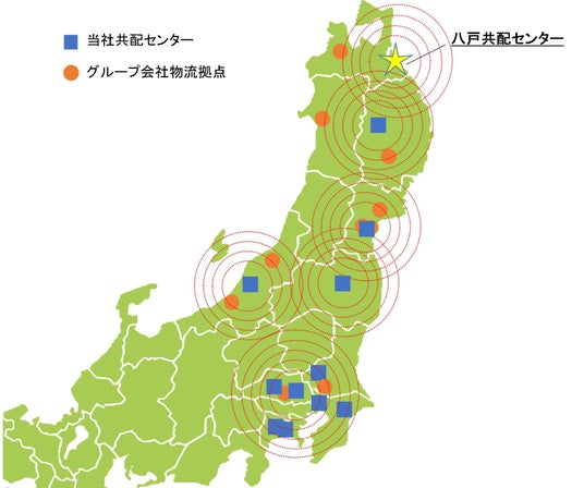 当社は1945年(昭和20年)の創業以来、食品物流に特化し、関東を中心に事業を展開しておりましたが、2011年の東日本大震災を機に、段階的に東北エリアへ物流拠点を構えてまいりました。現在当社では、関東エリア7拠点に加え、2020年に宮城県仙台市、2022年に岩手県滝沢市と新潟県長岡市、2024年に福島県郡山市に共配センター※を開設し、東日本全域をカバーする配送ネットワークの構築を進めてまいりました。この度の八戸共配センター新規開設により、グループ会社でありますアサヒフレッシュロジ株式会社(埼玉県さいたま市大宮区/代表取締役社長 森立郎)の既存の物流拠点の活用を含めた、アサヒロジスティクスグループでの自社オペレーションによる共配ネットワークが完成いたします。