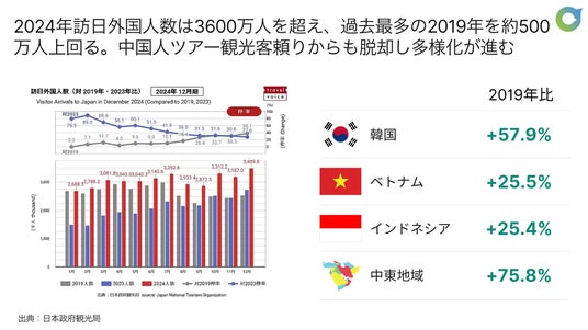 2024年には訪日外国人数が3,600万人を超えました。これは過去最多だったコロナ前の2019年の人数を約500万人上回るもので、インバウンド観光が完全に復調したことを示しています。また、これまで日本のインバウンド観光は中国人団体観光客に支えられてきましたが、現在は中国以外の東アジア・東南アジア、そして中東地域などの成長が著しく、訪日外国人の国籍・言語の多様化が進んでいます。
