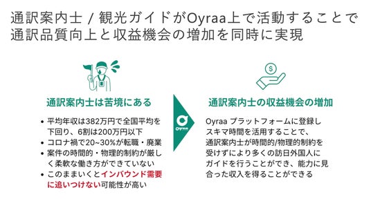 観光ガイド目線でも、Oyraaは物理的・時間的制約から解き放たれ柔軟な収益機会を得られる稀有なアプリです。各地域内の通訳案内士や認定観光案内人がOyraa上で活動することで、インバウンド観光客向けコミュニケーション品質の向上と彼らの収益機会増加を同時に実現していく試みも進めてまいります。