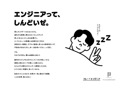 広告には、さまざまな「しんどい」に直面しながらも、自身のスキルと仕事に誇りを持って前向きに乗り越えているエンジニアへの応援と尊敬のメッセージが含まれています。イラストには、シンプルな線でニコニコした顔を表現する人気イラストレーター「わかる」さんを起用し、「しんどいあるある」を親しみやすく表現しました。