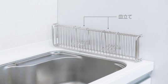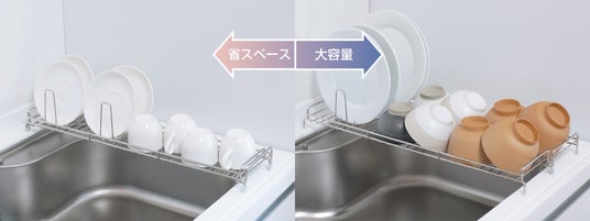 シンク奥や隙間に自立収納でき、本体側面に皿立てが掛けられます。