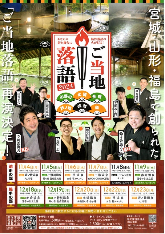 2024年は、これまでにできた「ご当地落語」を演者を変えて披露。山形・福島・宮城の旅館を会場に全6箇所・計11回の落語会を開催した。また、オンラインでの生配信も行い、全国の落語ファンにご当地の魅力を発信した。