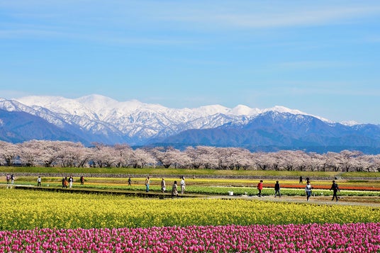 舟川の両岸1.2kmに咲く約280本の桜の開花時期に合わせて、地元の農家さんが育てた菜の花とチューリップが一斉に描くカラフル絶景が楽しめます。さらに残雪の朝日岳と白馬岳が重なり、美しい春の四重奏に。桜開花中は21時までライトアップも実施予定です。