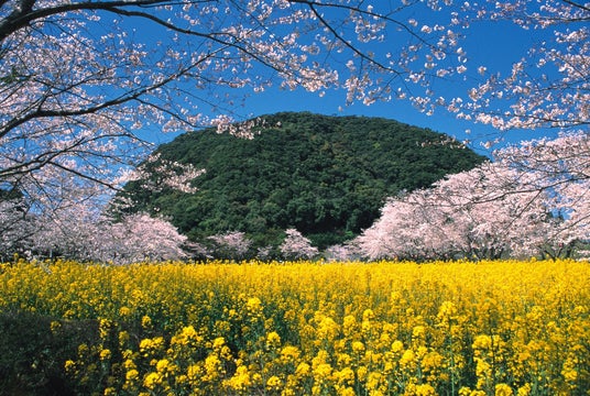 日本最大級の古墳群として知られる「西都原古墳群」に、30万本の菜の花と約2千本の桜が競演する華やかな春絶景スポット。東西約2.6km南北約4.2km・標高50~80mの台地に菜の花畑が広がり、それを縁取るようにソメイヨシノが咲き誇ります。