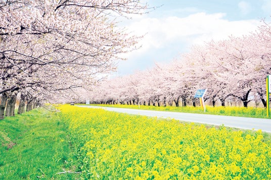 黄色とピンクの春色ラインが総延長11kmにわたって続く絶景ロードです。ソメイヨシノやベニヤマザクラなど、約4,000本の桜が咲き誇り、その両サイドには菜の花の黄色い絨毯が広がります。青空も交えた鮮やかなコントラストがとりわけ美しく、アップダウンのない一本道は、低めのアングルから眺めると迫力も抜群です。