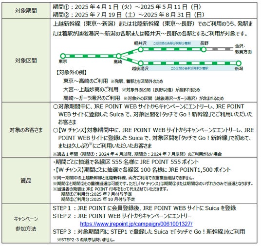 ○上越新幹線(東京~新潟)または北陸新幹線(東京~長野)をご利用いただいたお客さまのうち、越後湯沢~新潟または軽井沢~長野の各駅を発駅または着駅として「タッチでGo!新幹線」をご利用いただいたお客さまを対象に、抽選で各線区555名様(期間ごと)にJRE POINT 555ポイントをプレゼントするキャンペーンを実施します。