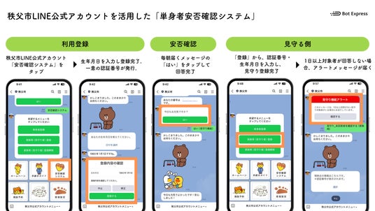 ほとんどの住民が、今、すぐに利用できるスマホ市役所「GovTech Express」を提供する株式会社Bot Express(本社:東京都港区、代表取締役:中嶋 一樹、以下 Bot Express)は、埼玉県秩父市(市長:北堀 篤)がGovTech Expressを活用し、秩父市LINE公式アカウント上から、安否確認が可能となる「単身者安否確認システム」の提供を開始したことをお知らせいたします。