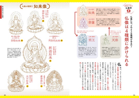 如来・菩薩・明王・天部・高僧・円空という6つのカテゴリーに分け、基本となる仏像を紹介。大迫力の写真と仏画を使って、仏像の種類や特徴、ルーツなどを分かりやすく解説します。仏画制作は種智院大学人文学部教授で現役仏師の長谷法寿さん。仏像の事を誰よりも知り尽くした仏師ならではの仏画で精密かつリッチな紙面が実現しました。