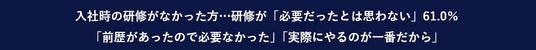 一方、入社時の研修がなかった方に、研修が必要だったかどうかを聞いてみると「必要だったとは思わない」が61.0%という結果で、その理由としては「前歴があったので必要なかった」や「実際にやるのが一番」などが挙がりました。