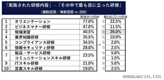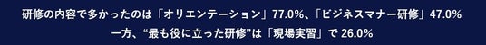 一方、実施された研修の中で最も役に立ったものについては、「現場実習」が26.0%とトップで、次いで「オリエンテーション」の22.5%でした。