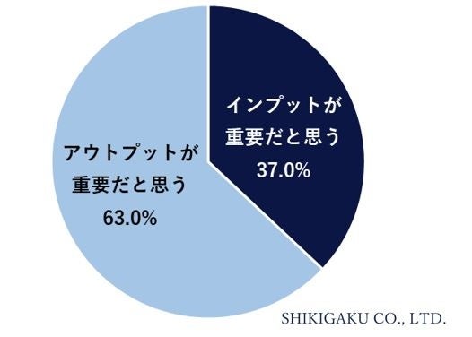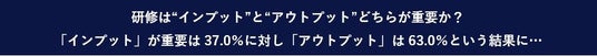 ここまでの調査のキーワードとして「研修が実践に活かされるか否か」が重要であるということがわかってきました。そこで最後に、研修においてインプット(=実践に活かされるかに関わらず学ぶこと)とアウトプット(=実践で活かされる)のどちらが重要かをお聞きしました。その結果「インプット」は37.0%だったのに対し、「アウトプット」は63.0%でした。