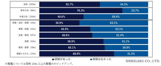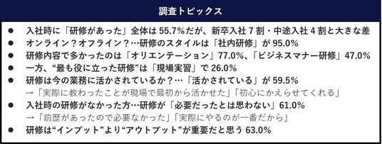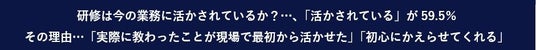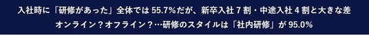 入社時に「研修があった」55.7%…新卒入社7割・中途入社4割と差/ 研修は今の業務に「活かされている」59.5%「実際に教わったことが現場で最初から活かせた」「初心にかえらせてくれる」