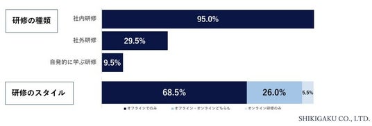 次に、社内か社外かなどの研修の種類についてと、オフラインかオンラインかなどの研修のスタイルについてお聞きしました。種類については、「社内研修」が95.0%という結果で、スタイルについては、「社内や現場など、オフラインでの研修のみだった」が68.5%でした。