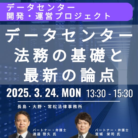 JPI(日本計画研究所)は、長島・大野・常松法律事務所 パートナー・弁護士 渡邉 啓久 氏、パートナー・弁護士 宮城 栄司 氏を招聘し、データセンターの開発・運営に関する法務の基礎と最新の論点について詳説いただくセミナーを開催します。