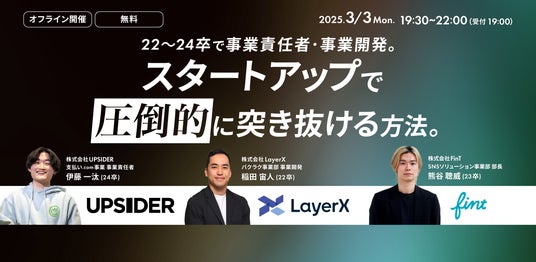 本イベントでは、UPSIDER、LayerX、FinTという注目スタートアップで活躍する若手エース社員を集めたスペシャル対談となっており、リアルな経験と、そこから得られた学びを、余すところなく語り尽くします。急成長を遂げるスタートアップの最前線で、どのような思考やアクションが求められるのか、そのエッセンスを体感いただける貴重な機会です。