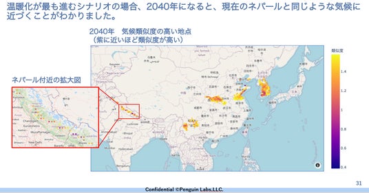 特に注目を集めたのは、TWINZの時間軸を持った分析機能です。2100年までの複数の気候変動シナリオに基づいたシミュレーションにより、「国内のある地点が将来、現在の世界のどの場所の気候に変化していくか」を予測できる機能を紹介。これにより、農業関係者は数十年先を見据えた栽培計画や品種選択が可能となり、気候変動に対する長期的な適応戦略を立てることができます。今回の講義では、「2040年の南相馬は現在のネパールと似た気候になる」といった予測から、将来的な農業経営の多角化や新規作物への転換を計画的に進める可能性について議論されました。