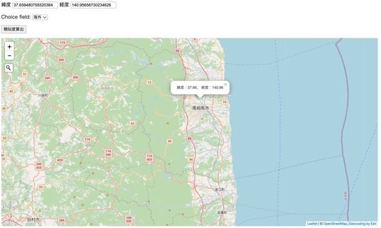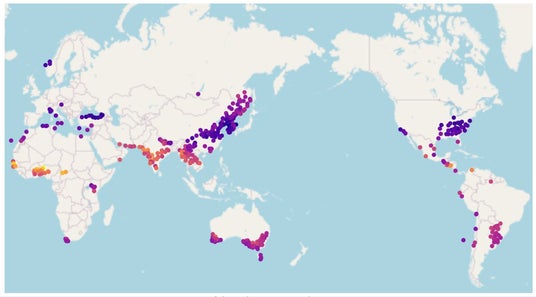 福島県南相馬市と似た気象条件を持つ地点をプロットしたもの、紫に近いほど類似度が高いことを示す