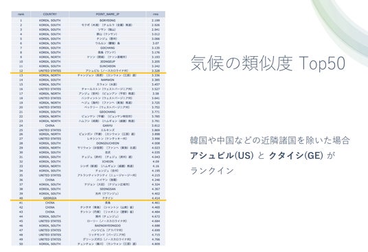類似度Top50のうち、今回はアメリカのアシュビルとジョージアのクタイシについて、特徴的な作物を調査