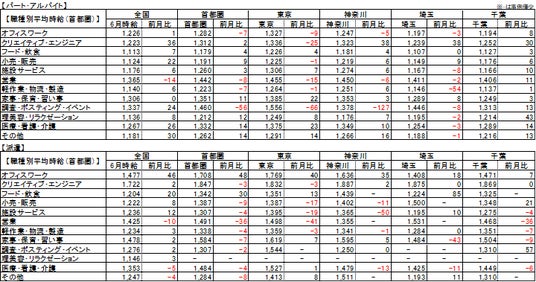全職種平均よりも時給が高い「資格必須の保育士」や大手企業での「コールセンター」の求人等が増加したことで、全体平均が引き上げられた。