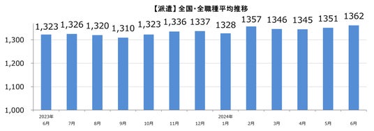 【派遣】全国・全職種平均時給は1,362円。前月比+11円。前年同月比+39円