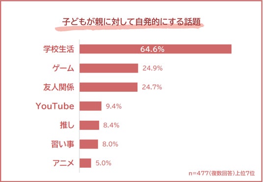 「子どもが親に対して自発的にする話題」を聞いたところ、圧倒的1位は「学校生活(64.6%)」で、6割以上の人から回答を得ました。2位「ゲーム(24.9%)」、3位「友人関係(24.7%)」が続きます。