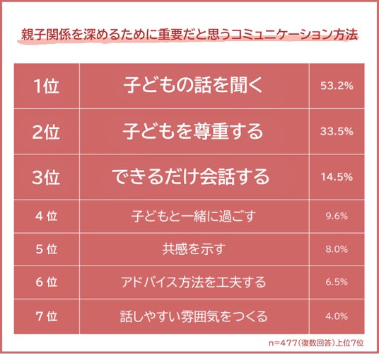 小学生以上の子どもをもつ477人に「親子関係を深めるために重要だと思うコミュニケーション方法」を聞いたところ、圧倒的1位は「子どもの話を聞く(53.2%)」、次ぐ2位は「子どもを尊重する(33.5%)」でした。
