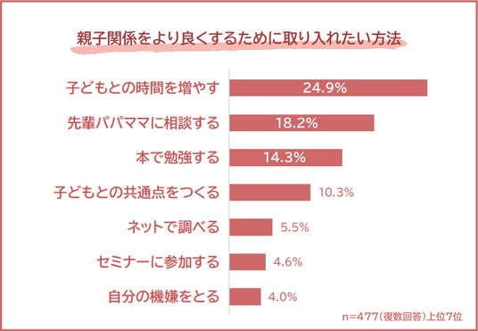 「親子関係をより良くするために取り入れたい方法」を聞いたところ、1位は「子どもとの時間を増やす(24.9%)」でした。2位は「先輩パパママに相談する(18.2%)」、3位は「本で勉強する(14.3%)」でした。