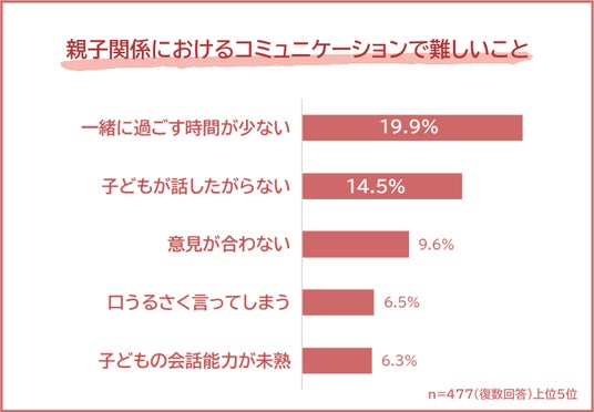 「親子関係におけるコミュニケーションで難しいこと」の1位は「一緒に過ごす時間が少ない(19.9%)」でした。2位「子どもが話したがらない(14.5%)」、3位「意見が合わない(9.6%)」が続きます。