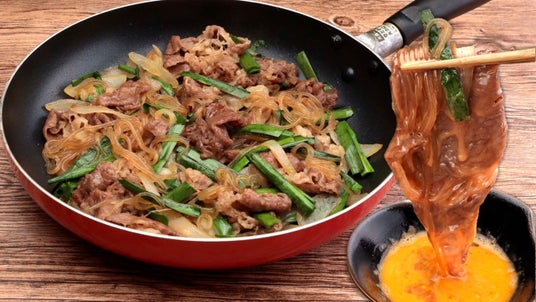 「和牛」や「国産牛」を使用したプルコギに卵をからめて、韓国風すき焼に♪