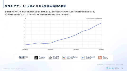 調査対象アプリの1ヶ月あたりの利用時間を合算し推移を見ると、2023年12月から2024年12月の1年間で約7倍に増加しています。